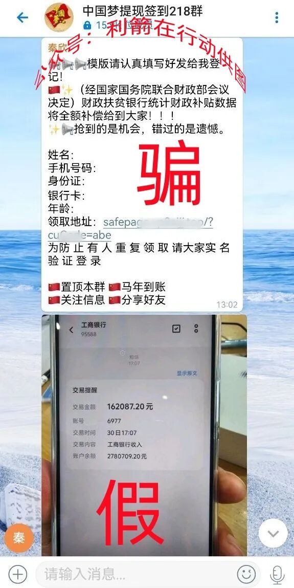 在一个“中国梦提现签到”群里面,有人在宣传,只要填写身份信息,交给他就可以领到“财政扶贫银行”的“全额补偿”,并且还发了收到16万多元的收款截图,这是一眼假的骗局,我国没有“财政扶贫银行”,即使国家要发钱,也不会是把资料交给来路不明的个人!