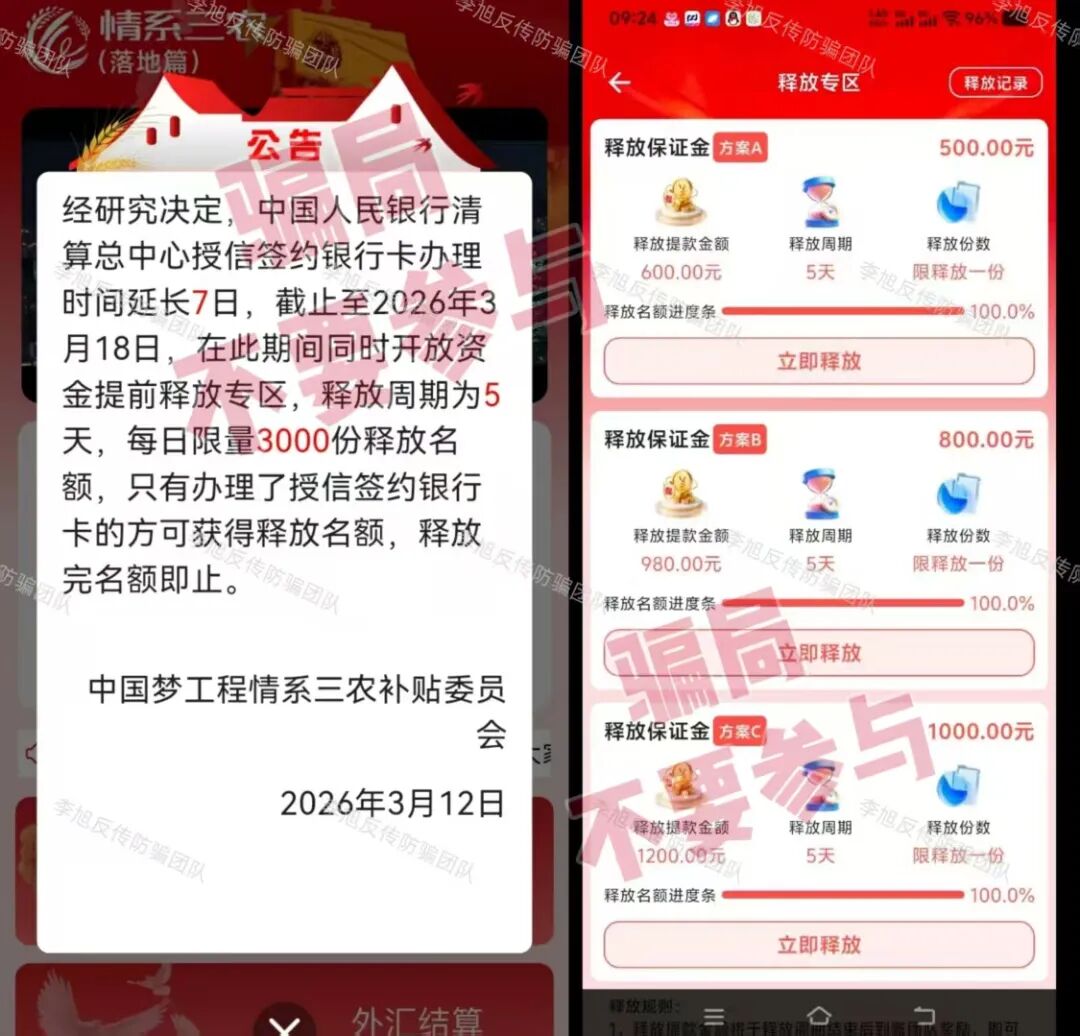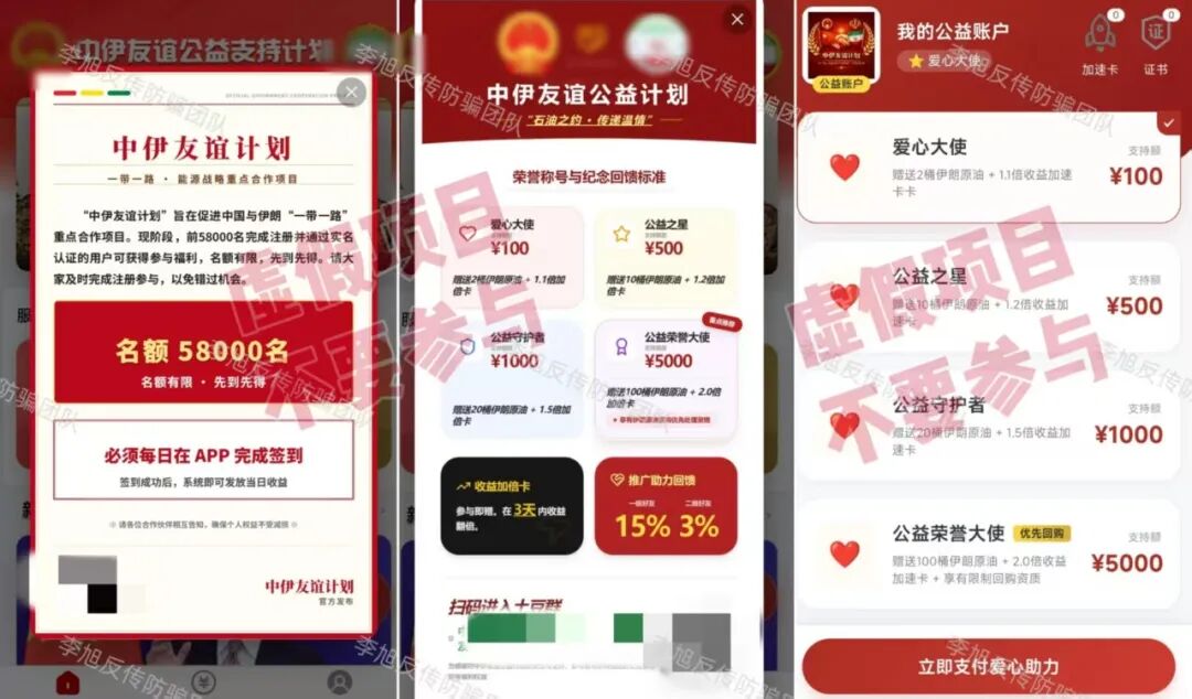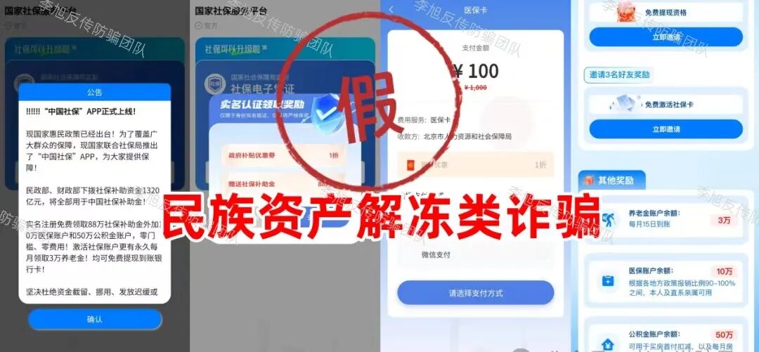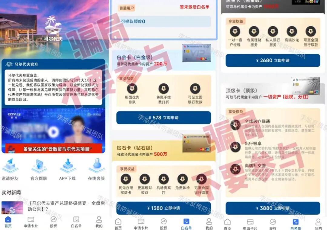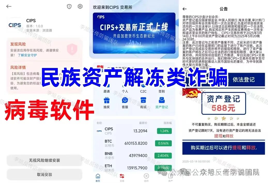 “中伊友谊”APP 蹭时政热点出现的诈骗项目。声称每日签到可获得原油等高额收益,以此骗取用户提交身份证照片等详细个人信息。 同时打着“捐赠”名义,让参与者支付100—5000元费用晋升等级,但收款方账户不停变更,根本没有对公账户,大多为个人。可见这个项目并非官方项目。不但软件未通过备案,IP地址也在境外,遇到请务必远离! “银龄扶贫行动”APP 冒充“扶贫办”工作人员,打着“扶贫”的幌子,用“免费房产”、“黄金”、“补贴金”等吸引参与者提交个人信息申请办理。 这种看似填写个信息就能领到所谓“福利”的项目,因为参与流程简单,在中老年群体中十分“受欢迎”。但其实只要稍加核实,就可以发现这些网站的IP地址都在境外,根本不是正规平台,就是冲着参与者个人信息来的。很多参与者以为只是提交个银行卡账号,卡里没钱就不会受损。殊不知,在很多网络骗局项目里,那些不停变换的个人充值收款方账户,大多都来源于此。参与者很可能在不知不觉中,就成了不法分子的帮凶。 假冒的“中国社保”APP 冒充“社保局”制作假的“社保”APP,谎称为参与者免费发放社保补助金、医保账户余额、公积金余额等福利,主要针对的就是中老年群体。 正规官方的社保类APP会根据不同省市在应用商店上架,例如“河南社保”APP、“山西社保”APP、“天津人力社保”APP等等,且全部通过了备案,属于正规的政府服务平台。 而这个连备案信息都没有,在应用商店更是查找不到的软件,妥妥的“李鬼”,大家一定擦亮双眼,仔细甄别,别被免费福利的噱头骗了。 “马尔代夫3.0”APP 自“云数贸张健”被绳之以法,打着其名头出现的“马尔代夫”相关项目也是层出不穷。一会儿说能分红,一会儿说给股权,每一个都标榜自己是真的,实则都是假的。 最近出现的“马尔代夫3.0”也是如此,假借4张号称内含高额资产的卡片吸引参与者提供身份证照片并缴纳578—3880元申请费,还要开通所谓的“白名单”。 似曾相识的老套路,目标就是参与者的信息和口袋里的本金。 “圆梦中华”APP 冒充“国家项目”,利用“730万复兴资金”和“每月3000元”这些离谱的承诺作为诱饵,忽悠参与者完成提交个人身份信息、邀请新人等任务,用于申请“福利卡”、“一卡通”等等所谓的“专属卡片”。 这些卡片都是伪造的,不但取不出资金,很可能还会成为骗子未来收取各种“解冻金”、“提现金”的工具。 去年9月,北京警方就针对此类利用假“补贴专用卡”实施的诈骗行为进行过详细披露。请广大网友,尤其是中老年朋友务必警惕。 “精准扶贫”“养老补贴专用卡”“VIP金卡”!收到这种“银行卡”,请立即剪碎! “CIPS+沙盒计划”APP 原名“CIPS沙盒计划”。在2024年,跨境银行间支付清算有限责任公司就已明确声明:从未任何面向社会的投资项目,包括“CIPS沙盒计划”。 关于警惕假冒我公司名义实施诈骗的严正声明 七星关公安也曾发布预警,提醒广大群众远离该项目。 警惕!!CIPS沙盒计划骗局 然而,这个骗局又以“全民回归、资金兑付”的名义卷土重来。 其实,最简单且直接的识别方式,就是下载的时候手机系统已经提示存在高风险、包含病毒。遇到此类提示,一定不要忽视,尽快拉黑卸载,才能保障个人信息和财产安全。 “人民资产”APP 小编已经反复预警多次的虚假项目。目前,这个项目甚至都不依赖APP运作,每天通过不停更换的网址链接供大家登录。经查,这些网址的IP地址全在境外。 但无论是面对多个相关机构的接连声明,还是各地警方“不要下载!”的大声疾呼。众多参与者依旧视若无睹,也难怪家属们无力地表示“根本劝不回来”。 紧急提醒!不要下载“人民资产”APP! 国开行辟谣的“人民资产”是什么?记者实探:号称投资600元80天赚8万元!一位投资人的女儿:劝不住她,警察都拦不住 “帮扶工程”APP 谎称国家扶持的帮扶项目,引诱那些想要申请扶持金的参与者提交详细的个人身份信息,还要求上传手持身份证的照片,甚至还需要交100-300元预约费。 正规的帮扶项目,不仅不会收取任何形式的费用,还会在官方政务平台等正规渠道公示,但这个软件未通过备案,IP地址也在境外。明显是一个假项目,大家不要相信。 “和衷慈协”APP 由“上合慈协”更名后开始利用高回报向参与者销售假的黄金礼包产品。 “情系三农落地篇”APP 已经数不清是第几次延期,至今还在忽悠,参与这个项目的人趁早止损才是明智之举,别抱着幻想越陷越深。 冒牌的“海南银行”APP 冒充“海南银行”引诱大家点击陌生链接下载软件,谎称完成实名注册即可获得800万资产。 但APP未通过备案,只能通过浏览器安装,且被提示存在高风险,IP地址也在境外。 不仅如此,注册下载后需交188元开通所谓的“绿色到账通道”。但收款方却并非“海南银行”对公账户,而是不同的个人或第三方公司账户,典型的套牌骗局特征。 这已经不是“海南银行”第一次被冒用,去年3月,“海南银行”就曾发布公告,表明该行有唯一官方网址和官方APP,任何以其名义设立的网络连接均不可信。大家核对一下就能分辨真假。 “某某汇通” 拿着“文化数字化政策”当挡箭牌,吹嘘“稳赚不赔”“增值闭环”,但实际没有任何真实的文化资产交易或盈利支撑。 用户想要参与,必须先认购所谓的数字藏品,或缴纳费用升级VIP,通过拉人数量