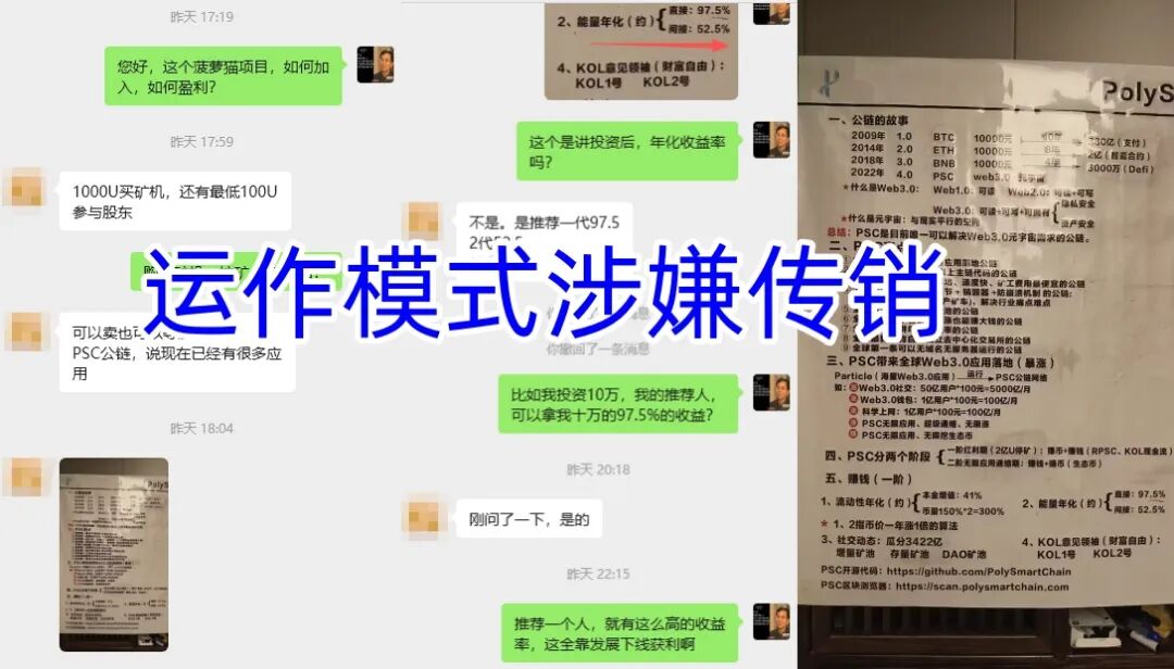 发行CAT代币、PSC等虚拟货币,炒作质押、挖矿模式,诱导购买矿机,靠拉人头组建团队获取收益,交易依赖USDT链上操作,资金去向无法追踪。