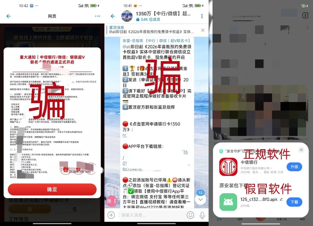 谎称与微信支付联合推出“银联超V联名卡”,宣称注册就送30万元保证金,最高可领1350万权益奖励,App界面模仿正规中信银行,极具迷惑性。