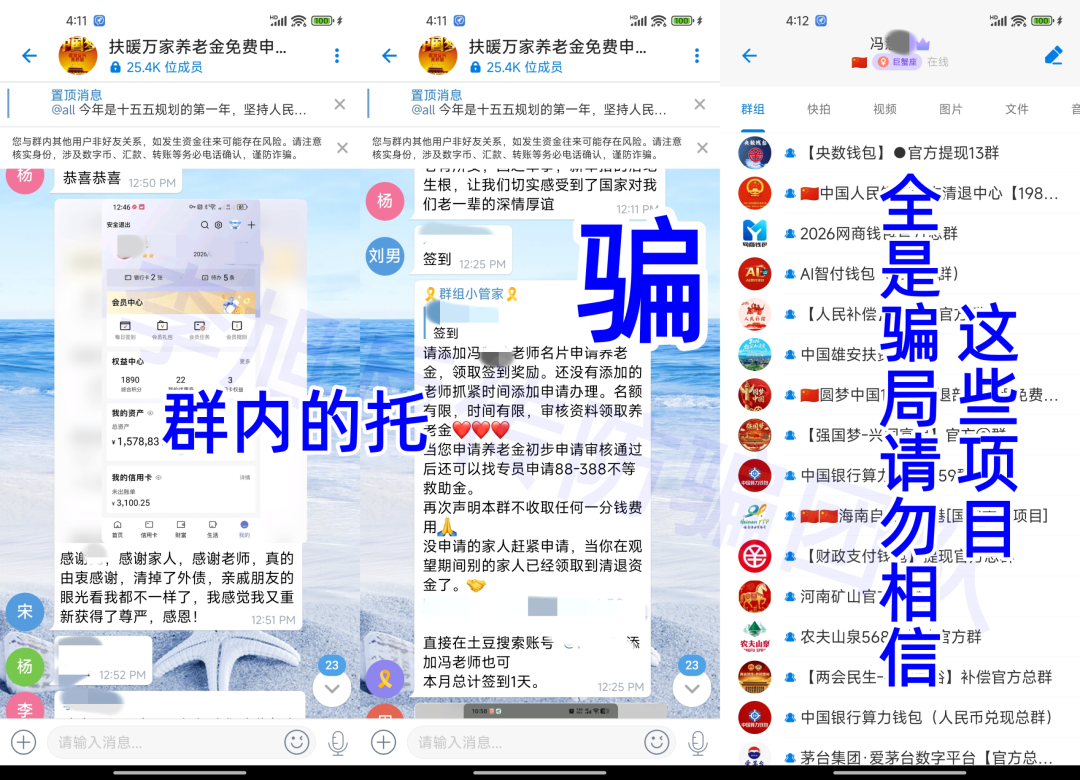 宣称是国家援助平台,承诺发放88-388万养老金/救助金,群内托儿频繁发布虚假银行余额,还谎称“不收取任何费用”,实则后续会以办卡、开通账户等名义诱导交钱。