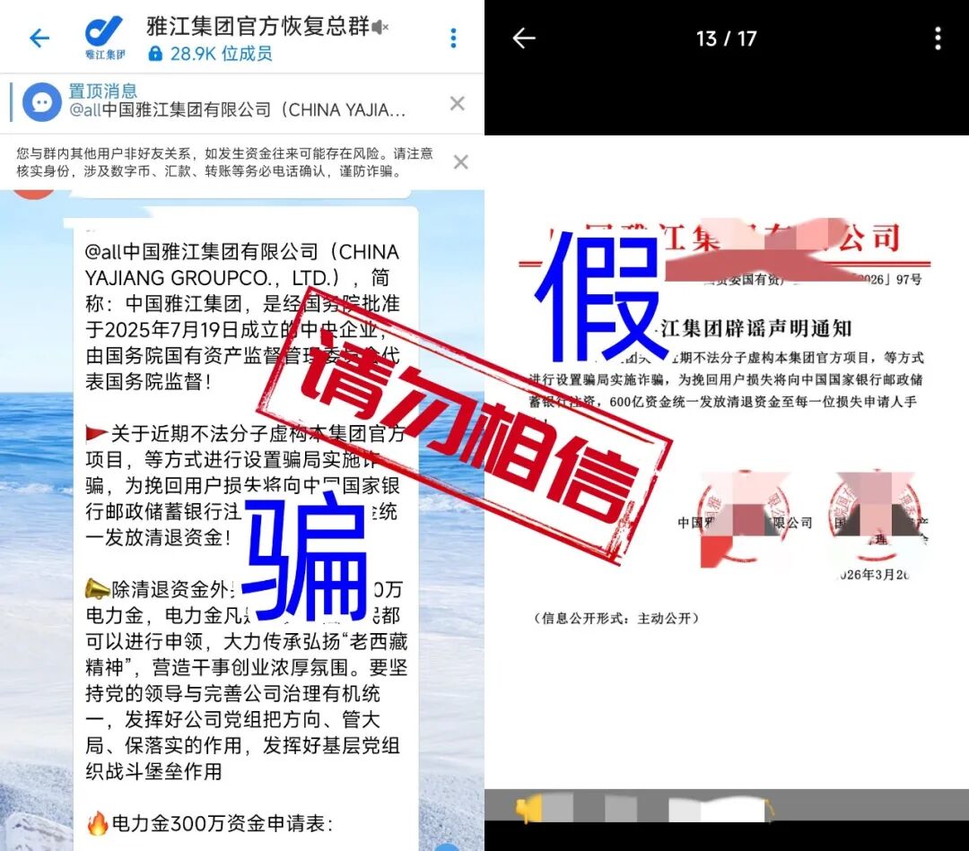 去年各类雅江集团、雅江水电站骗局已全部关网跑路,近期骗子又卷土重来,打着“官方恢复、挽回损失”的旗号,发布虚假辟谣声明,谎称联合银行注资600亿清退,还能免费领300万电力金。