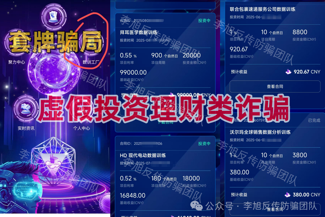 不法分子冒充某公司的旗号,打着“人工智能+”“数训工厂”等名义,制作散布涉诈APP,虚构推广每日返息到期返利高额理财项目,该项目采用传销模式发展下线,收款账户为个人、第三方公司,涉嫌传销、诈骗、洗钱等。