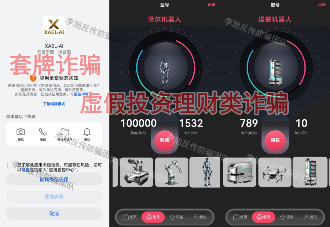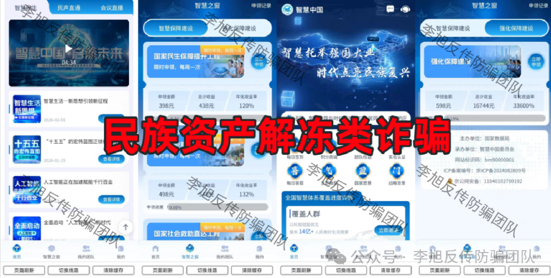 不法分子冒充国家数据局的名义,打着“人工智能”的旗号,制作散布涉诈APP,虚构推广“智慧保障建设”“强化保障建设”等高额返利理财项目,采用传销模式发展下线,收款账户为个人、第三方公司,涉嫌传销、诈骗。