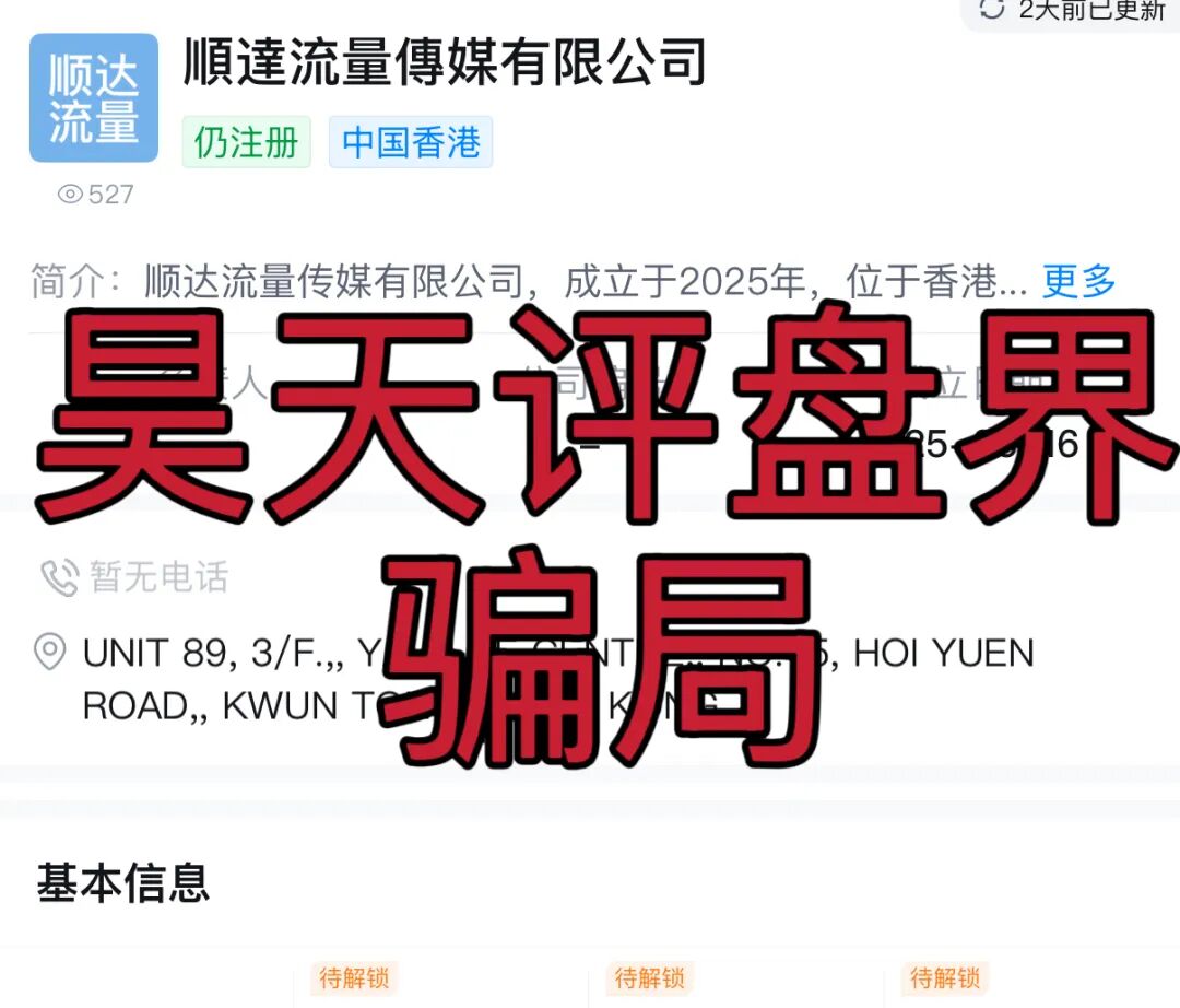 昊天评盘界友情提醒:顺达流量传媒有限公司推出的百乐宫彩票平台属于典型的资金盘骗局,多次收割会员,千万不要别被骗了,高度预警,即将崩盘跑路!近期昊天评盘界发现知乎,小红书,微博,抖音等app都有冒充昊天的诈骗团伙,希望大家记住了昊天评盘界是反诈自媒体账号并不做任何项目,更不会去推广任何项目,除公众号外其他一律不是本人,切勿上当受骗!