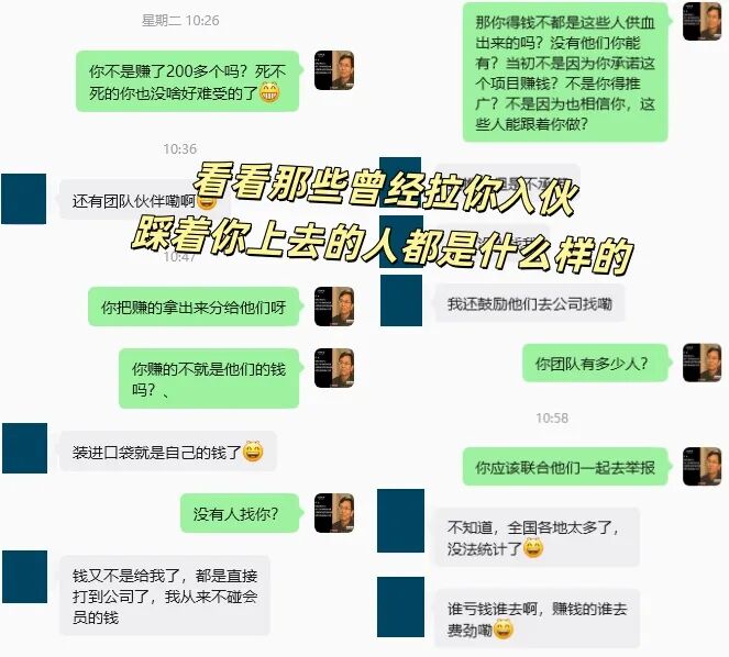 这些黑心项目方心狠手辣,卷钱跑路毫无底线;但更可恨的还有那些层层拉人头、忽悠亲朋好友入局的大小团队长,明知是资金盘还刻意洗脑造势,踩着无数普通人的血汗钱牟取私利,害人害己!
