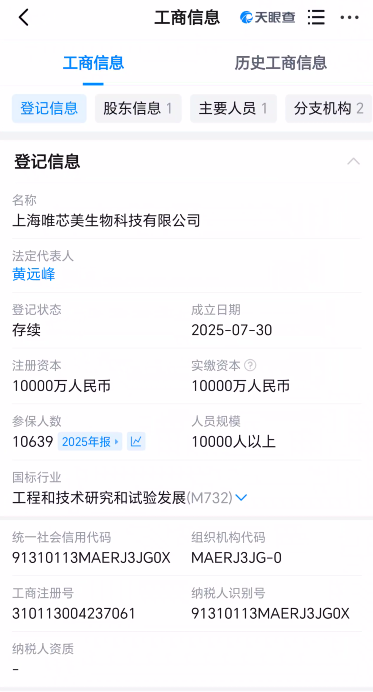 上海唯芯美生物科技公司2025年7月30日注册,至今仅9个月,却对外展示注册资本1亿、实缴1亿、参保人数10639人,这套包装专门收割不懂行的散户,核心噱头和风险一眼看穿:
