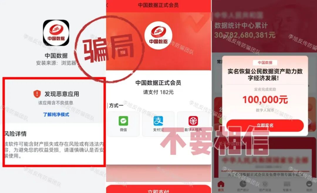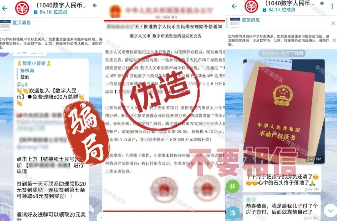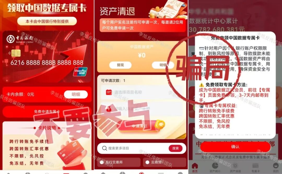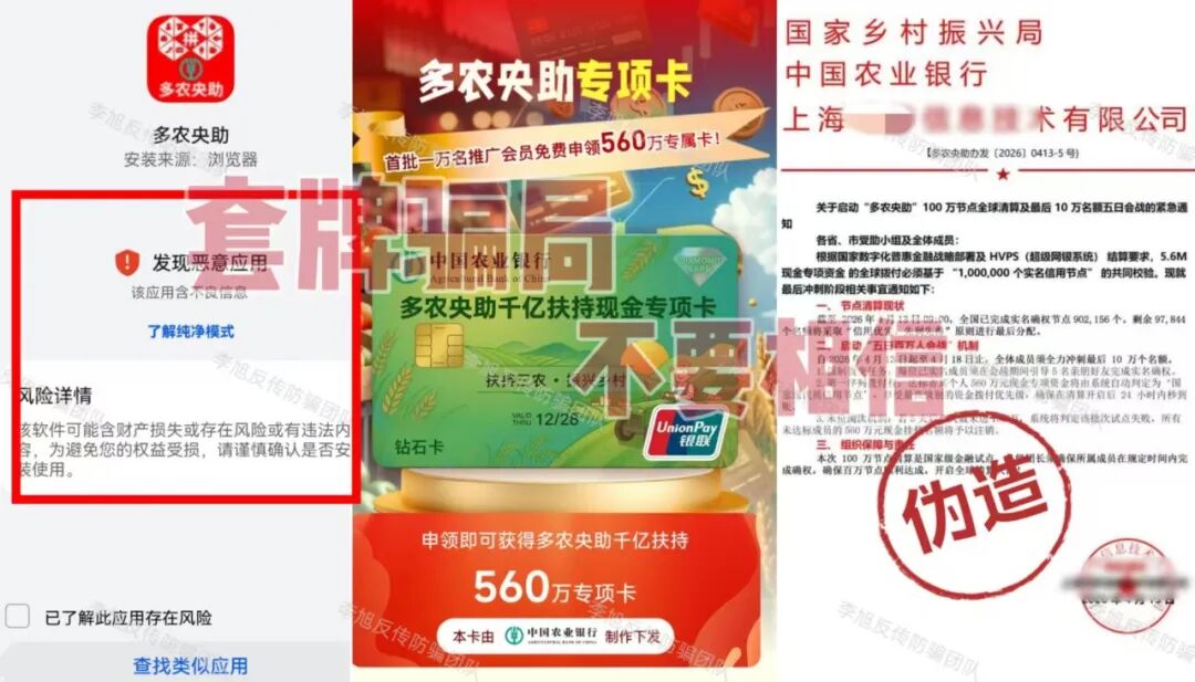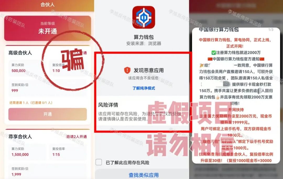 虚构的“中国数据”APP 蹭“十五五”规划热点,谎称能帮那些在所谓“国家项目”里受损多年的朋友挽回损失,以此为诱饵,忽悠大家办理“专属卡”。同时利用高额数字人民币奖励不断拉拢新人加入。 但是,该软件只能通过某境外聊天软件的项目群中发布的陌生链接才能下载,安装时提示未通过备案,为恶意应用,IP地址在境外,是明显的境外诈骗。 参与者下载后就需要提交身份证正反面,个人信息暴露无遗,还需要缴纳128元才能成为所谓的“正式会员”。至于那些必须拉人头才能获得的“收益”,不过是账户里一串永远提不出来的数字,后期还会成为骗子巧立名目继续收费的借口。请大家务必远离,这种来路不明的链接,千万不要点。 “1040数字人民币理赔补偿项目” 伪造政策文件,打着“清退补偿”名义,声称为参与数字人民币项目遭受损失的参与者理赔600万资金。它所谓的“登记”,其实就是套取参与者的身份证、银行卡等极其详细个人敏感信息。 有意思的是,项目才刚刚出现,群里就冒出很多“参与者”兴奋地晒出“还清房贷”、“交了首付”的截图。很明显,这些都是骗子安排的“托儿”,专门在群里烘托“真实可靠”、“马上就要发财”的气氛,目的就是让大家放松警惕,乖乖交出信息。 而这些信息,很可能被用于转移涉诈资金,致使大家的银行卡被冻结,甚至因此面临“帮信罪”等法律追责。 天上不会掉馅饼,更不会掉600万,这种“好事”千万别信。 碰瓷的“拼多多-多农央助”APP 冒充“拼多多”官方项目,谎称是与农业银行合作推出惠民项目,以办理“现金专项卡”就能领取560万补助金为名,吸引人上钩。 最近更是以“结算”之名忽悠大家升级并完成节点确权,用于获得优先放款权。 但这个APP下载就提示未备案且被系统标注为恶意应用,是一个没有备案的非法套牌网站。 大家一定要认准官方渠道,所有需要通过陌生链接下载的、声称能发巨额补助的“官方APP”,99.9%都是假的。 虚构的“幸福万家(幸福e家)”APP 打着“国家扶贫”的旗号,以发放高额扶贫金为诱饵,要求参与者提交身份证等个人信息完成实名认证。 自去年开始,该项目已经向参与者多次收费,最近又开始假借“提现”之名再次要求大家补缴3850元。 注意!这是一个典型的境外诈骗,请已经参与的朋友一定要清醒,继续投入只会扩大损失,及时止损,立即退出才是唯一正确的选择。 Crypto DAO 分红质押类项目,披着“去中心化金融”和“AI预测”的高科技外衣,忽悠参与者将虚拟货币进行“质押”,承诺每天有1%甚至更高的“静态收益”,并利用“V1到V4等级体系”、“智能合约自动执行”等话术进行包装,宣称一两年能获得几百倍回报。 但是,稍微有点金融常识的朋友都知道,世界上不存在长期、稳定、日进斗金且“稳赚不赔”的投资。任何投资的收益最终都来源于实体经济创造的利润,波动和风险是常态。 这种承诺固定高日息的项目,本质就是“庞氏骗局”,用后来者的本金支付前面人的收益,一旦没有新人加入,崩塌就在瞬间。 记住,你看中它的高息,它盯着你的本金。 虚构的“雄安扶贫”APP 蹭“雄安新区”政策热点出现的虚假项目。打着“国家”旗号,声称参与者可免费领取巨额扶贫款和房产,以此套取用户信息。 目前,这个APP已经以“系统维护升级”为名关闭。按照这类骗局的惯用套路,等它再度“上线”时,就会进入真正的“收割阶段”,开始以“手续费”、“保证金”、“税款”等名义向参与者收钱。 所有以“免费领取国家巨额福利”为开头的,基本都是骗局的开始,大家还是尽早远离! 虚构的“算力钱包”APP 通过伪造政策文件冒充国家相关部门,谎称注册就送500万算力,并通过拉人头数量来划分会员等级,鼓励复投。 平台还冒充工作人员索要用户详细个人信息,声称每日签到可得299现金币。 但是,这些都是平台自行操控的空气币,币值涨跌全由骗子说了算,没有任何实际价值。 等真的想提现时,各种“条件”和“手续费”就来了,这才是骗子收网的时刻。从下载时被系统标注为“恶意应用”就足以说明一切,千万不要安装。 成都69800组织 网友被多年未联系的同学以“前往成都应聘电商工作”为由邀约,随后对方伪造职场氛围,通过七天封闭洗脑、伪造政府背书等手段,通过话术灌输"宏观调控""国家扶持"等伪概念,诱导网友缴纳69800元参与该项目,承诺高额回报。 网友陷入的是典型的传销组织,通常打着“连锁经营”“1040工程”“阳光工程”“资本运作”“国家项目”等旗号,内部宣讲五级三阶制、几何倍增,利用拉人头发展下线,声称出局可获得千万元回报。 亲历成都“连锁经营”传销迷途五日:一场精心编织的“网恋”迷局 深陷成都1040阳光工程传销:三人亲历,揭秘南派传销洗脑骗局 黄石大冶“连锁经营”组织 该组织打着“资本运作”“自愿连锁经营业”的旗号,采用“五级三晋制”发展下线,宣称首份投资3800元,41份共计135800元,出局可赚1720万。 网恋入局、深陷骗局:湖北黄石大冶“自愿连锁经营”传销亲历者自述,一场以爱为名的洗脑陷阱 投资135800出局可赚1720万?卧底揭秘 “骑着电动车穿梭在湖北大冶的传销大军”