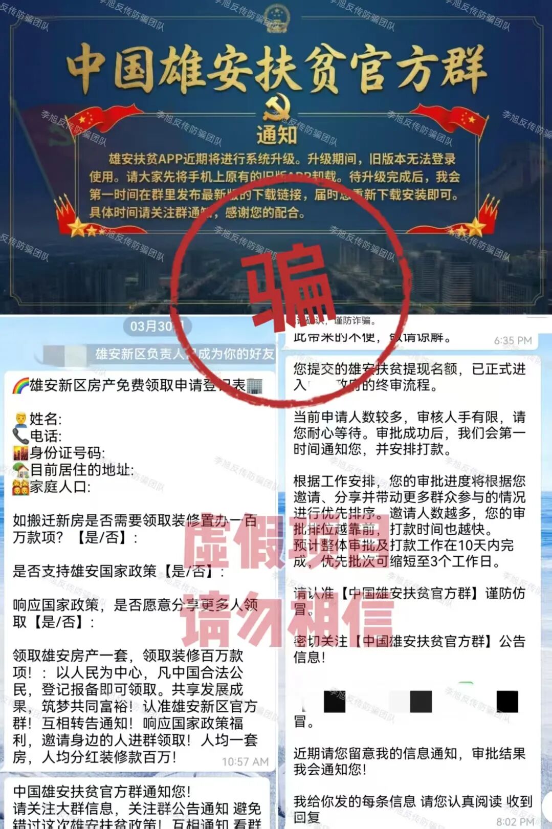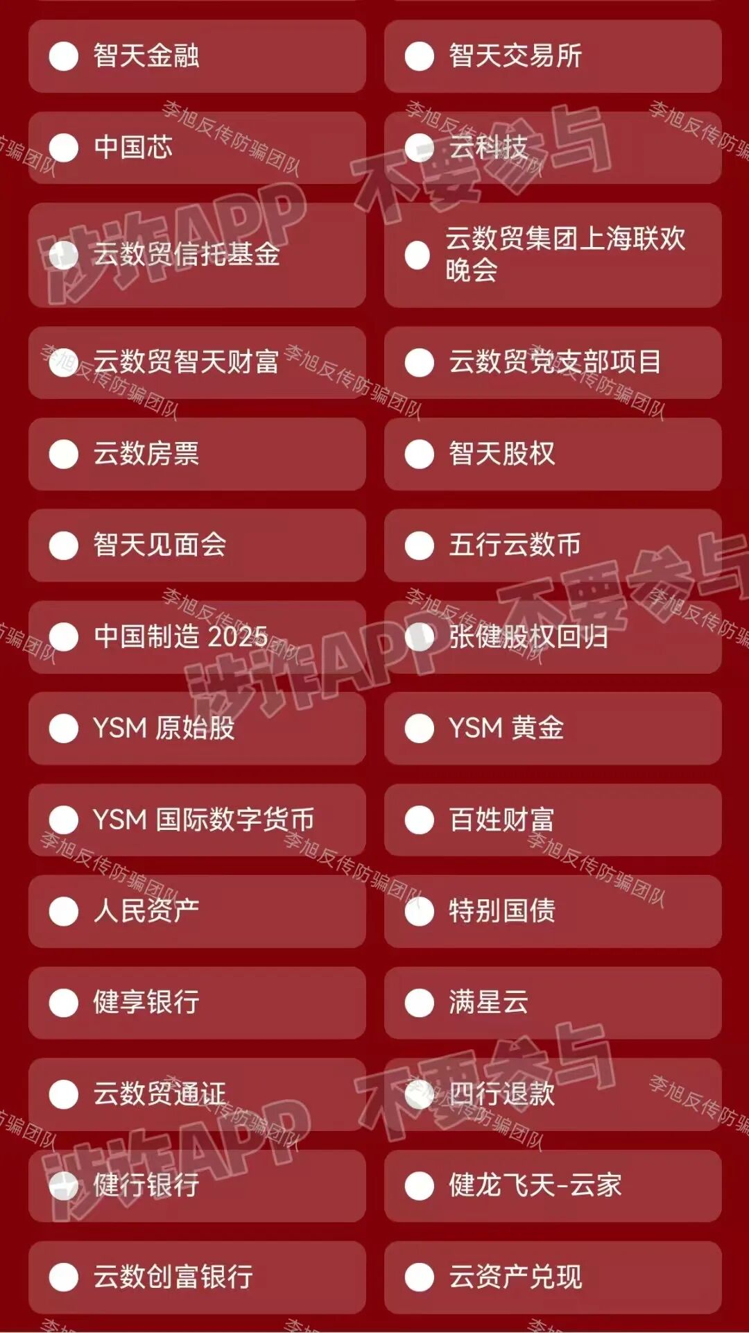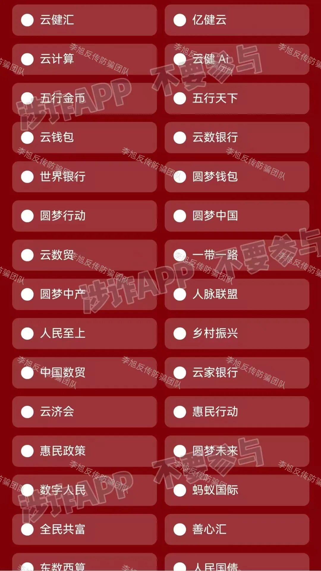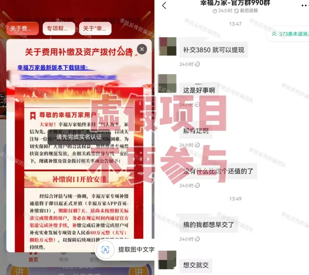 虚构的“中国数据”APP 蹭“十五五”规划热点,谎称能帮那些在所谓“国家项目”里受损多年的朋友挽回损失,以此为诱饵,忽悠大家办理“专属卡”。同时利用高额数字人民币奖励不断拉拢新人加入。 但是,该软件只能通过某境外聊天软件的项目群中发布的陌生链接才能下载,安装时提示未通过备案,为恶意应用,IP地址在境外,是明显的境外诈骗。 参与者下载后就需要提交身份证正反面,个人信息暴露无遗,还需要缴纳128元才能成为所谓的“正式会员”。至于那些必须拉人头才能获得的“收益”,不过是账户里一串永远提不出来的数字,后期还会成为骗子巧立名目继续收费的借口。请大家务必远离,这种来路不明的链接,千万不要点。 “1040数字人民币理赔补偿项目” 伪造政策文件,打着“清退补偿”名义,声称为参与数字人民币项目遭受损失的参与者理赔600万资金。它所谓的“登记”,其实就是套取参与者的身份证、银行卡等极其详细个人敏感信息。 有意思的是,项目才刚刚出现,群里就冒出很多“参与者”兴奋地晒出“还清房贷”、“交了首付”的截图。很明显,这些都是骗子安排的“托儿”,专门在群里烘托“真实可靠”、“马上就要发财”的气氛,目的就是让大家放松警惕,乖乖交出信息。 而这些信息,很可能被用于转移涉诈资金,致使大家的银行卡被冻结,甚至因此面临“帮信罪”等法律追责。 天上不会掉馅饼,更不会掉600万,这种“好事”千万别信。 碰瓷的“拼多多-多农央助”APP 冒充“拼多多”官方项目,谎称是与农业银行合作推出惠民项目,以办理“现金专项卡”就能领取560万补助金为名,吸引人上钩。 最近更是以“结算”之名忽悠大家升级并完成节点确权,用于获得优先放款权。 但这个APP下载就提示未备案且被系统标注为恶意应用,是一个没有备案的非法套牌网站。 大家一定要认准官方渠道,所有需要通过陌生链接下载的、声称能发巨额补助的“官方APP”,99.9%都是假的。 虚构的“幸福万家(幸福e家)”APP 打着“国家扶贫”的旗号,以发放高额扶贫金为诱饵,要求参与者提交身份证等个人信息完成实名认证。 自去年开始,该项目已经向参与者多次收费,最近又开始假借“提现”之名再次要求大家补缴3850元。 注意!这是一个典型的境外诈骗,请已经参与的朋友一定要清醒,继续投入只会扩大损失,及时止损,立即退出才是唯一正确的选择。 Crypto DAO 分红质押类项目,披着“去中心化金融”和“AI预测”的高科技外衣,忽悠参与者将虚拟货币进行“质押”,承诺每天有1%甚至更高的“静态收益”,并利用“V1到V4等级体系”、“智能合约自动执行”等话术进行包装,宣称一两年能获得几百倍回报。 但是,稍微有点金融常识的朋友都知道,世界上不存在长期、稳定、日进斗金且“稳赚不赔”的投资。任何投资的收益最终都来源于实体经济创造的利润,波动和风险是常态。 这种承诺固定高日息的项目,本质就是“庞氏骗局”,用后来者的本金支付前面人的收益,一旦没有新人加入,崩塌就在瞬间。 记住,你看中它的高息,它盯着你的本金。 虚构的“雄安扶贫”APP 蹭“雄安新区”政策热点出现的虚假项目。打着“国家”旗号,声称参与者可免费领取巨额扶贫款和房产,以此套取用户信息。 目前,这个APP已经以“系统维护升级”为名关闭。按照这类骗局的惯用套路,等它再度“上线”时,就会进入真正的“收割阶段”,开始以“手续费”、“保证金”、“税款”等名义向参与者收钱。 所有以“免费领取国家巨额福利”为开头的,基本都是骗局的开始,大家还是尽早远离! 虚构的“算力钱包”APP 通过伪造政策文件冒充国家相关部门,谎称注册就送500万算力,并通过拉人头数量来划分会员等级,鼓励复投。 平台还冒充工作人员索要用户详细个人信息,声称每日签到可得299现金币。 但是,这些都是平台自行操控的空气币,币值涨跌全由骗子说了算,没有任何实际价值。 等真的想提现时,各种“条件”和“手续费”就来了,这才是骗子收网的时刻。从下载时被系统标注为“恶意应用”就足以说明一切,千万不要安装。 成都69800组织 网友被多年未联系的同学以“前往成都应聘电商工作”为由邀约,随后对方伪造职场氛围,通过七天封闭洗脑、伪造政府背书等手段,通过话术灌输"宏观调控""国家扶持"等伪概念,诱导网友缴纳69800元参与该项目,承诺高额回报。 网友陷入的是典型的传销组织,通常打着“连锁经营”“1040工程”“阳光工程”“资本运作”“国家项目”等旗号,内部宣讲五级三阶制、几何倍增,利用拉人头发展下线,声称出局可获得千万元回报。 亲历成都“连锁经营”传销迷途五日:一场精心编织的“网恋”迷局 深陷成都1040阳光工程传销:三人亲历,揭秘南派传销洗脑骗局 黄石大冶“连锁经营”组织 该组织打着“资本运作”“自愿连锁经营业”的旗号,采用“五级三晋制”发展下线,宣称首份投资3800元,41份共计135800元,出局可赚1720万。 网恋入局、深陷骗局:湖北黄石大冶“自愿连锁经营”传销亲历者自述,一场以爱为名的洗脑陷阱 投资135800出局可赚1720万?卧底揭秘 “骑着电动车穿梭在湖北大冶的传销大军”