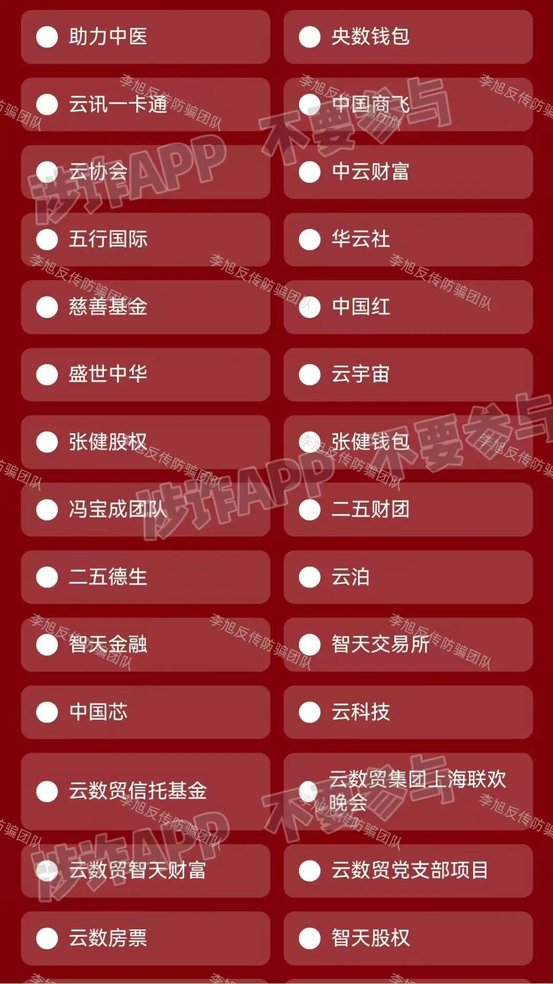 另外,在我们总结今天的案例过程中,发现了堪称“骗子界最有自知之明”的一位。一个打着“清退”旗号的虚假软件中,罗列了大量号称可以“清退”的项目。虽然“退赔”是假,但这个名单却像一份“骗局指南”,上面列出的名字,几乎都是无法兑现任何承诺的陷阱和资金盘。这也从侧面印证了这些项目的性质。骗子自己,有时反而“最懂行”。图片奉上,大家可以自行查看,尽早远离! 上下滑动查看更多