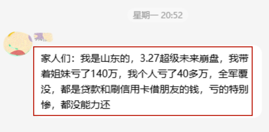 4月下旬了,网络中的各种“投资项目”,应该是“投机项目”让许多人血本无归,负债累累,看到一个被骗40万,下面人一共被骗了140万元的被骗人很无奈的讲述:所交的钱都是贷款和刷银行卡,给朋友借来的钱,感到心酸、心痛!